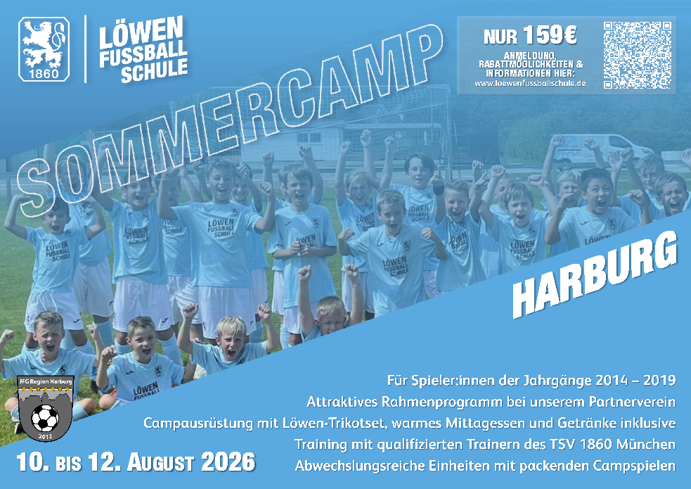 Die Löwen-Fußballschule des TSV 1860 München kommt im Sommer 2026 erneut nach Harburg! Gemeinsam mit der JFG Region Harburg findet wieder ein dreitägiges Sommercamp für fußballbegeisterte Kinder statt – unser gemeinsames, sportliches Highlight in den Sommerferien.